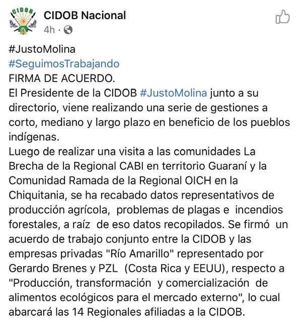 PZL and Bolivian indigenous association agreements, CIDOB, August 3, 2021